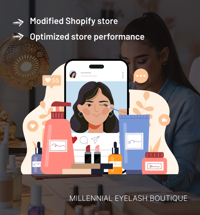 Millennial Eyelash Boutique is redefining the meaning of beauty in the world of fast-changing trends. The semi-technical client sells their products (eyelashes, eyeshadows, and brow shaping) online to the women of every age. We were approached by the client to enhance their existing Shopify store.